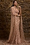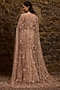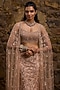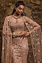 Featuring a rose gold fish-cut lehenga in net base with sequins and glass bead hand embroidery. It is paired with a blouse and a cape. Accentuate it with zircon jewellery and heels for wedding, sangeet or cocktail ceremony.