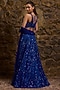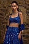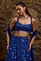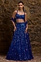 Featuring a royal blue lehenga in net base with sequins, crystal and glass bead hand embroidery. It is paired with a blouse and a dupatta. Accentuate it with zircon jewellery and heels for wedding, sangeet or engagement ceremony.