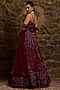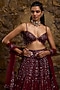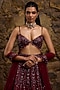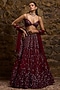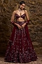 Featuring a wine lehenga in net base with sequins, crystal and glass bead hand embroidery. It is paired with a blouse and a dupatta. Accentuate it with zircon jewellery and heels for wedding, sangeet or cocktail ceremony.