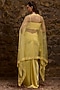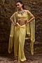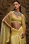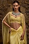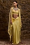 Featuring a yellow draped skirt in satin, organza and net base with sequins, crystal and glass bead hand embroidery. It is paired with a blouse and a cape. Accentuate with statement jewellery and heels for a festive occasion or haldi ceremony.