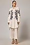 Featuring a white shirt in cotton poplin base with metallic beads and rhinestone hand work, including machine embroidery. It is paired with pants. Accentuate it with minimal jewellery and mules for brunches or casual outings.