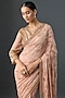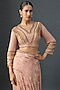 Featuring a baby pink saree in silk chiffon base with sequins embroidery. It is paired with a blouse. Accentuate it with statement jewellery and embellished heels for a festive occasion, wedding or sangeet ceremony.