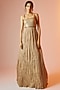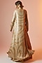Featuring a beige jacket in chiffon base with sequins sheeted embroidery. It is paired with a matching gown and a skirt.
