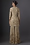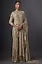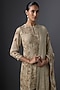 Featuring a mushroom-colored kurta in chinon base, adorned with sequins embroidery. It is paired with gharara pants and a dupatta. Accentuate it with polki earrings and wedges for festive occasions or sangeet ceremony.