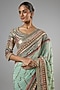 Featuring a porcelain blue saree in chiffon base with thread embroidery. It is paired with a blouse. Style it with statement jewellery, potli and heels for a festive occasion, wedding or engagement ceremony.