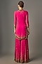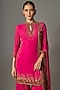 Featuring a rani pink kurta in chiffon base, adorned with thread embroidery. It is paired with a sharara and a dupatta. Style it with stud earrings, a sleek bun, and wedges for a festive or wedding ceremony.