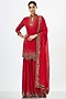 Featuring a red kurta in chiffon base with sequins embroidery. It is paired with matching sharara pants and a dupatta.