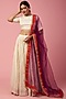 Featuring an ivory lehenga in cotton base with gold woven motifs. It is paired with a crop style blouse having gold stripes and a purple tulle dupatta having hot pink and red finishing. Accentuate this designer set with statement jewellery and heels for a complete look, ideal for a festive occasion or sangeet ceremony.