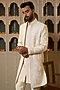 Featuring a beige indowestern in dupion silk base with handwork. It is paired with a kurta and pants. Style it with mojaris for a reception, wedding, sangeet or engagement ceremony.