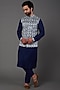 Featuring a blue velvet bundi jacket in velvet base with embroidery. It is paired with a silk kurta and pants. Perfect wear for a wedding or sangeet ceremony, exuding charm and elegance.