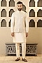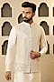 Featuring a peach bundi jacket in dupion silk base with mirror work. It is paired with a kurta and pants. Style it with pair of mojaris for a festive occasion, wedding, sangeet or engagement ceremony.