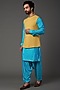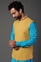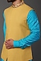 Featuring a yellow bundi jacket in linen base with thread embroidery. It is paired with a blue silk kurta and pants. Perfect wear for a wedding or sangeet ceremony, exuding charm and elegance.