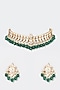 Featuring a micro gold finish necklace studded with green onyx and kundan polki, set in brass. It is paired with a matching pair of earrings.