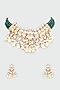 Featuring a gold finish choker necklace studded with pearls, kundan polki, and green beads, set in brass. It is paired with a matching pair of earrings.