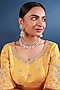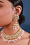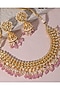Featuring a gold finish necklace studded with pink kundan polki and pink drops, set in brass. It is paired with a matching pair of jhumka earrings.