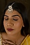 Featuring a micro gold finish maangtikka studded with green pearls and kundan polki, set in brass. Perfect wear for festive occasions or wedding ceremonies.