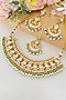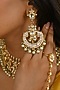 Featuring a micro gold finish necklace studded with kundan polki, green pearls and white beads, set in brass. It is paired with a matching pair of earrings and a maangtikka. Perfect wear for festive occasions or wedding ceremonies.