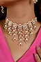 Featuring a micro gold finish necklace studded with kundan polki and pearl drops, set in brass. It is paired with a matching pair of earrings. Perfect wear for festive occasions or wedding ceremonies.