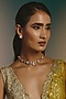Featuring a micro gold finish necklace studded with moissanite polki, set in brass. It is paired with a matching pair of earrings. Perfect for festive occasions, weddings or cultural events, this jewellery is a wardrobe must for those who love to shine effortlessly.