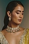 Featuring a micro gold finish choker necklace studded with multi-colored kundan polki and green semi-precious stone, set in brass. It is paired with a matching pair of earrings. Perfect for festive occasions, weddings or cultural events, this jewellery is a wardrobe must for those who love to shine effortlessly.