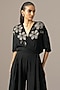 Featuring a black box pleated jumpsuit in jersey base with floral details. Accentuate it with statement earrings for a stylish ensemble, perfect for evening wear, dinner dates and special celebrations.