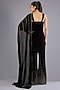 Featuring a black jumpsuit in micro satin base with palla. Style it with strappy heels, bold earrings, and a sleek low ponytail for a polished look. Perfect for cocktail nights, receptions, sangeet functions, and glamorous festive events.