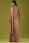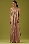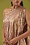 Featuring a gold one-shoulder draped gown in crepe base with geometric embellishments.