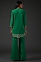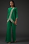 Featuring a green overlap top in snake crepe base with thread embroidery. It is paired with matching pants.