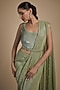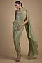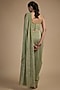 Featuring a jade green pre-draped saree in shimmer crepe base with geometric hand embellishments. It is paired with a blouse and a belt. Accentuate it with statement jewellery and heels for a wedding or mehendi ceremony.