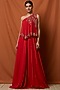 Featuring a red off shoulder gown in georgette base with floral hand and machine embellishments.
