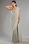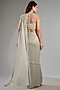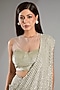 Featuring a silver draped saree in shimmer chiffon base. It is paired with a corset blouse. Accentuate it with dangler earrings and heels for a wedding or cocktail ceremonies.