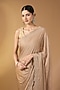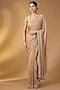 This luxurious beige satin saree with swarovski work. The saree comes with an unstitched blouse piece. Style it with a structured blouse, perfect for cocktail soirees or evening celebrations for head-turning glamour.