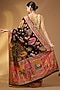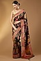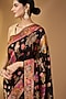 This opulent deep black pashmina silk saree with lotus, floral and peacock motif detailing. The saree comes with an unstitched blouse piece. Style it with a structured blouse and statement earrings for a refined look.