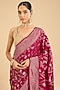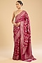 Featuring a fuchsia saree in linen base with zari floral embroidery. It is paired with an unstitched blouse. Accentuate it with dangler earrings and juttis for a festive occasion or pooja ceremony.