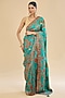 Featuring a green saree in crepe silk base with peacock print. It is paired with an unstitched blouse fabric. Style this exquisite ensemble with luminous diamond jewellery, heels and refined makeup for a timeless look perfect for festive occasion, sangeet or pooja ceremonies.