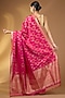 Embrace this vibrant magenta banarasi silk saree, which features intricate gold zari weaving. The fabric showcases detailed all-over jaal work and a delicate, small floral border. The pallu is richly adorned with intricate zari patterns, perfect for festive and special occasions. The saree comes with an unstitched blouse piece.