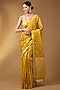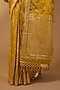 Embrace this marigold yellow saree crafted in banarasi silk. The entire body is covered in intricate all-over gold zari jaal work and shimmering mesh pattern. A small floral border provides a refined edge to the drape, while the fully woven gold zari pallu adds a heavy, luxurious finish. The saree comes with an unstitched blouse piece. Style it with a statement blouse and jewellery for a refined look; perfect for weddings and high-end celebrations.