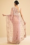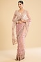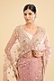 Featuring a mauve saree in net base with cutdana, pearls and sequins embroidery, including boota detail and scalloped border. It is paired with an unstitched blouse. Accentuate it with dangler earrings and juttis for a festive occasion or pooja ceremony.