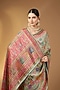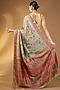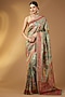 Drape yourself in this elegant mint green crepe silk saree with golden zari work, featuring all-over pastel floral and animal motifs. Bold pink floral and animal borders add a vibrant touch. Perfect for weddings and festive celebrations. The saree comes with an unstitched blouse piece.