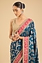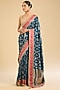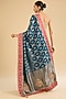 Featuring a peacock blue saree in georgette base with zari detailing. It is paired with an unstitched blouse fabric. Style it with wedges, gold jhumkas and a sleek bun for a chic ethnic look. Ideal for festive gatherings, family functions, or sangeet ceremonies.