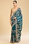 Featuring a peacock blue saree in glass tissue base with cutdana, sequins and jaal work. It is paired with an unstitched blouse fabric. Style it with wedges, gold jhumkas and a sleek bun for a chic ethnic look. Ideal for festive gatherings, family functions, or sangeet ceremonies.