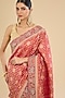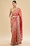 Featuring a pink saree in khadi georgette base with zaal, cutdana and dori embroidery. It is paired with an unstitched blouse fabric. Style this exquisite saree with luminous diamond jewellery, heels and refined makeup for a timeless look perfect for a wedding, haldi sangeet ceremonies.