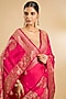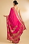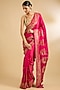 Featuring a pink saree in satin silk base with gota, cutdana and sequins embroidery. It is paired with an unstitched blouse. Accentuate it with polki stud earrings, a clutch and heels for a sangeet, engagement or pooja ceremony.