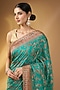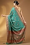 This magnificent rama green pashmina silk saree with zari border, floral and peacock jaal pattern. The saree comes with an unstitched blouse piece. Style it with a structured blouse and statement earrings for a refined look.