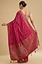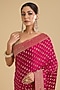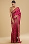 Featuring a rani pink saree in banarasi satin silk base with swarovski embellishments. It is paired with an unstitched blouse. Accentuate it with dangler earrings and juttis for a festive occasion or pooja ceremony.