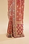Featuring a red saree in khadi georgette base with zaal, dori, cutdana and elephant motif hand and machine embroidery. It is paired with an unstitched blouse fabric. Style this exquisite saree with luminous diamond jewellery, heels and refined makeup for a timeless look perfect for a wedding, engagement sangeet ceremonies.