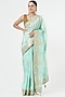 Featuring a sea green saree in silk base with gota patti work and gold zari weave. It is paired with an unstitched blouse fabric. Style this saree with statement earrings and heels for engagement, sangeet, or pre-wedding ceremonies.