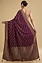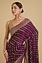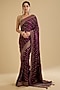 Featuring a wine woven saree in banarasi silk base with swarovski embellishments. It is paired with an unstitched blouse. Accentuate it with dangler earrings and juttis for a festive occasion or pooja ceremony.