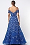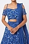 Featuring an electric blue lehenga in organza, satin, and shantoon base with glass beads, sequins, pearls, and crystal embroidery. It is paired with a matching blouse and a dupatta.