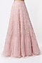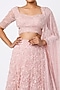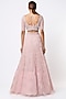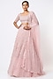 Featuring a pink lehenga in organza, net, and shantoon base with glass beads, sequins, pearls, and crystal embroidery. It is paired with a matching blouse having an attached dupatta.